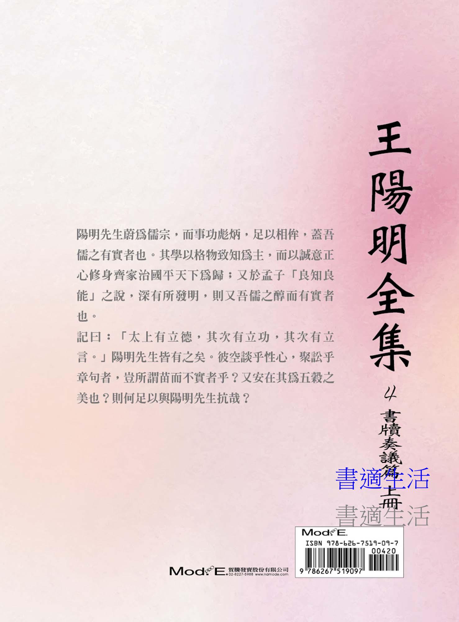 王文成公全書三十八卷,其首三卷為語錄,公存時,徐子曰仁輯;次二十八卷為「文錄」,為「別錄」,為「外集」,為「續編」,皆公甍後錢子洪甫輯;最後七卷為年譜,為世德紀,則近時洪甫與汝中王子輯而附焉者也。王陽明是我國明代中葉著名的哲學家,也是一位重要的教育家。他上承孟子,中承陸象山,發展了與程朱理學分庭抗禮的心學(又稱「陽明學、王學」),不僅在明代中後期風靡一時,而且對日本、朝鮮等國都產生了深遠的影響。