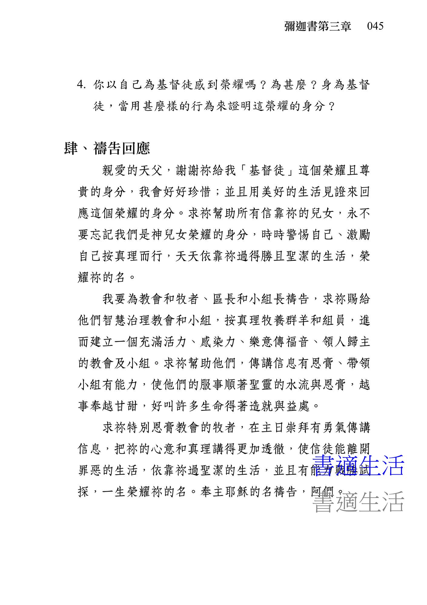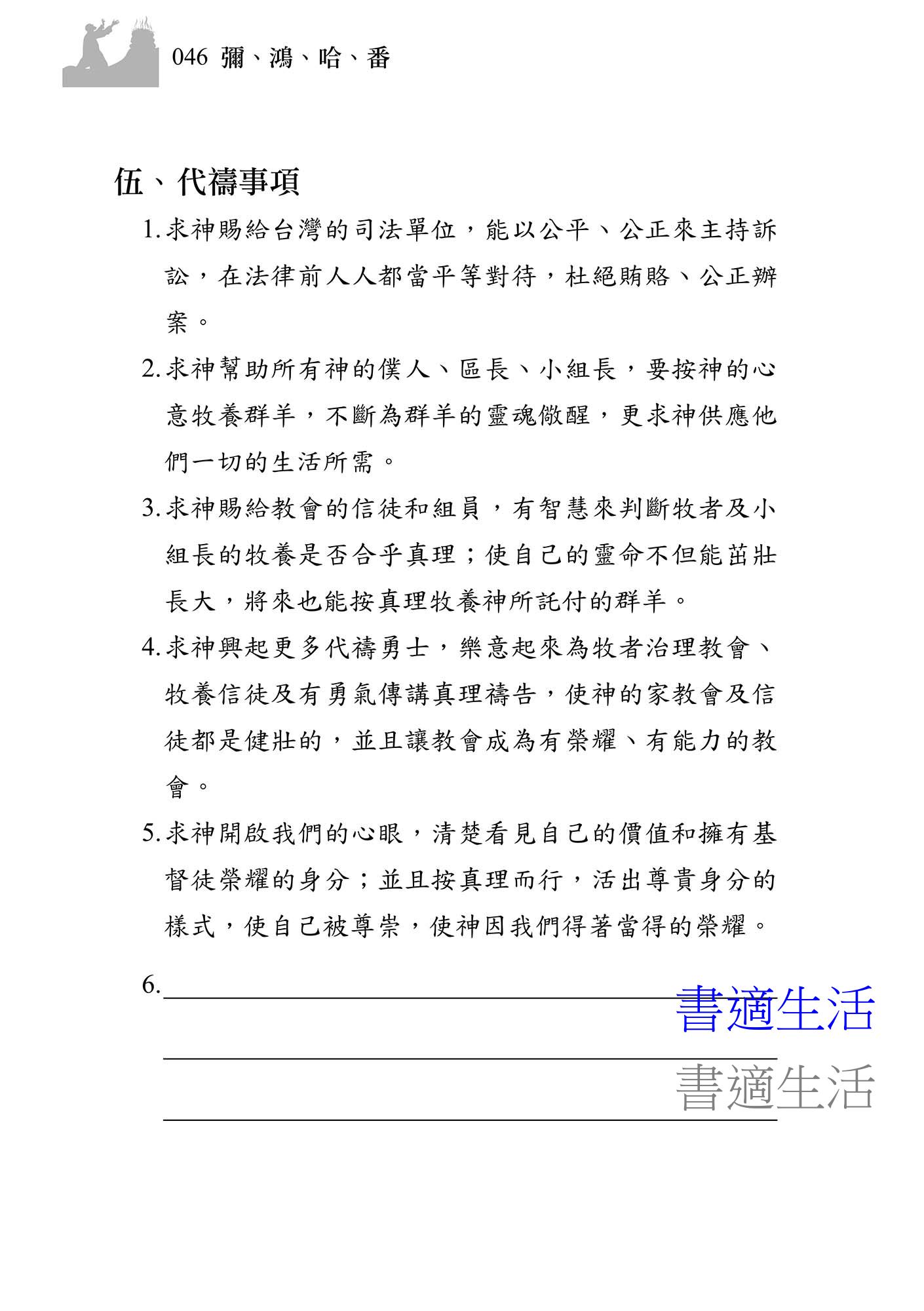 5 代禱事項:這些代禱事項是從該章經文所引發出來 的,你也可自加代禱事項在空白處。期待你的禱告不再只是內向的禱告,你當求神擴大你的禱告視野,常常求神的國和義,為別人、教會、所住城市及國家社會的需要代禱,使你成為一個被神所祝福的人。
