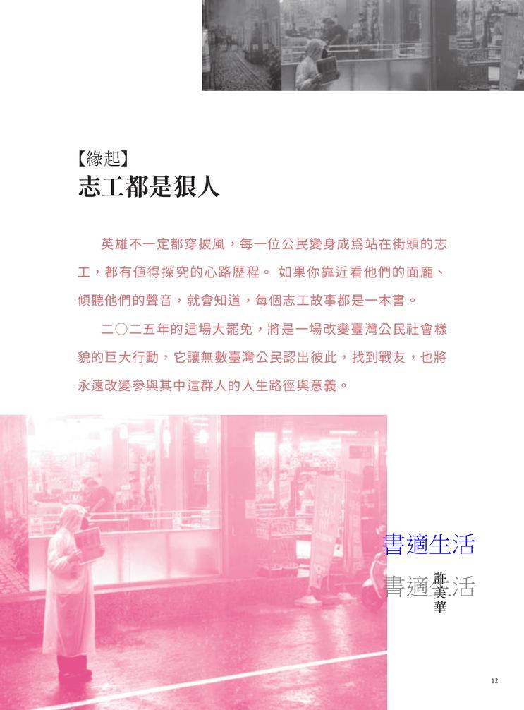 他們多數是從未站過街頭的政治素人、忙著送稚嫩幼兒上下學的年輕媽媽、經濟優渥內向退縮的女性、過去對政治冷感的人生勝利組、深藍家庭出生的政治小白兔、抱著正待治療的癌症身體、有自己小事業的中產階級、十一歲的小志工、退休的老師、等待一條安全回鄉路的海外臺灣人、深怕落人後地二話不說掏錢課金主……每一群人,各自不同,卻願意為了同一件事站出來。