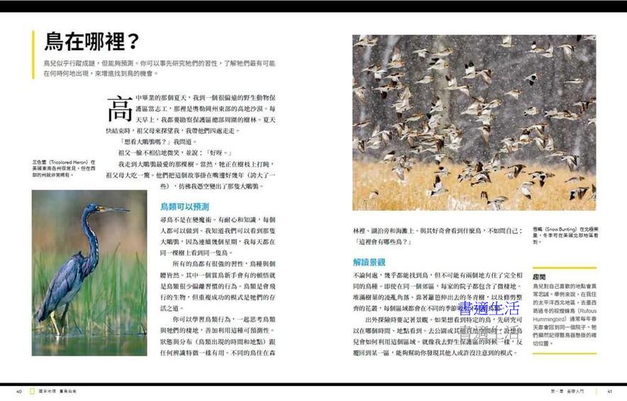 《國家地理賞鳥指南》是提供給新手賞鳥人的「最佳實踐入門書」,不管是剛開始賞鳥、辨認鳥或想享受鳥類世界,所需要知道一切資訊都在書中。