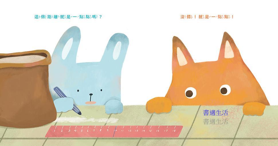 這個故事以一個再日常不過、生活裡常常出現的小疑惑:「一點點到底是多少?」作為出發點,展開角色之間的趣味對話,也引發讀者會心一笑。在尋找答案的過程中,兔子和狐狸一路發明出各種「看起來好像很聰明,其實有點離奇」的方法,結果越走越歪。看著他們毫無進展,不禁替他們捏把冷汗。