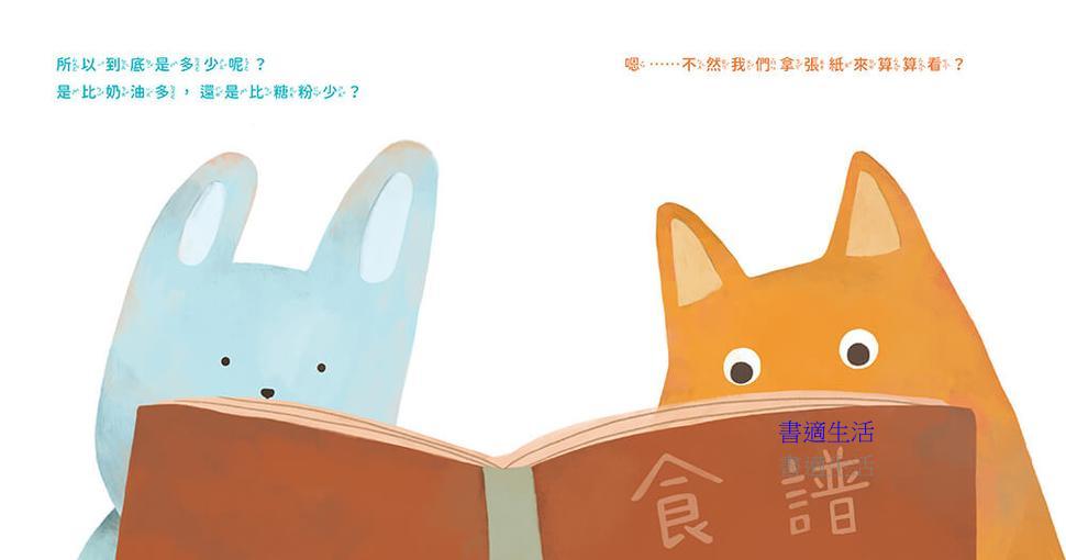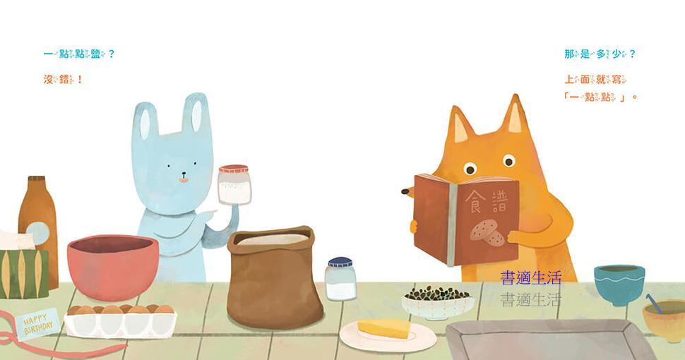 兔子和狐狸翻開食譜,拿出麵粉、糖粉、奶油、雞蛋和巧克力豆,一字排開,準備做一份特別的生日禮物。沒想到,他們馬上就遇到難題: