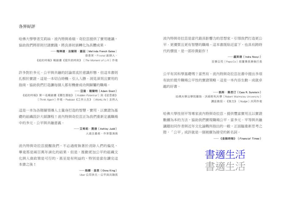 哈佛大學性別平等專家波內特與奇拉茲,提供豐富實用且以實證數據為本的方法,協助我們實現職場公平。當多元、平等與共融議題如同作者與近年文化論戰所指出的一般,正面臨重新思考之際,「公平」或許就是一個被廣為接受的新名詞。
