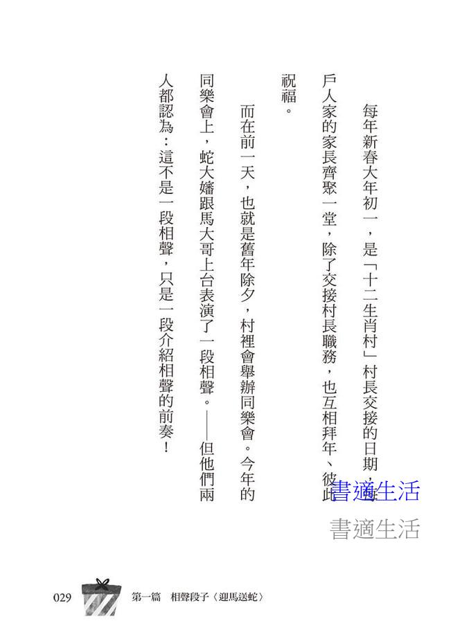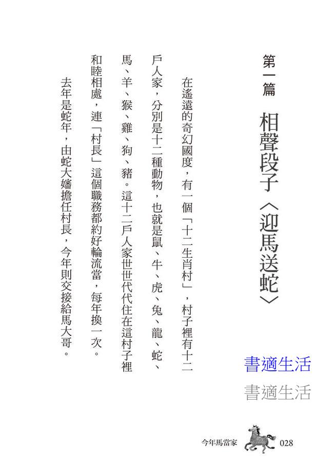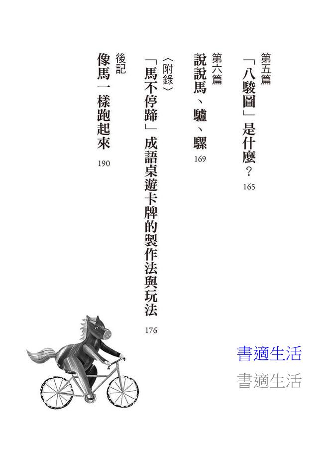 ★希望這本書,不但讓讀者更瞭解關於馬的各種文化象徵與馬年故事,也可以應用在生活上。譬如新春期間拜年,來一句「馬到成功」、「一馬當先」或者「龍馬精神」!或者寫作文時,來一句「塞翁失馬,焉知非福」,因為它讓我們對於不如意的事情產生了新的眼光。不用怕別人不懂,如果有人不懂,那正好可以向他們解釋解釋。