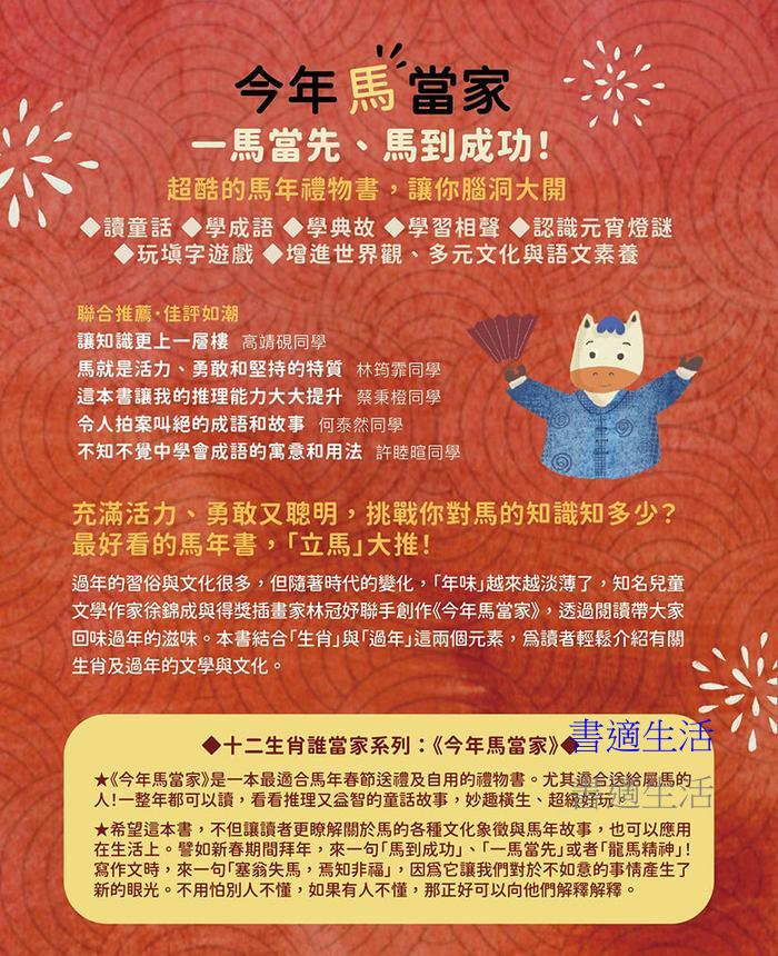 ★《今年馬當家》是一本最適合馬年春節送禮及自用的禮物書。尤其適合送給屬馬的人!一整年都可以讀,看看推理又益智的童話故事,妙趣橫生、超級好玩。