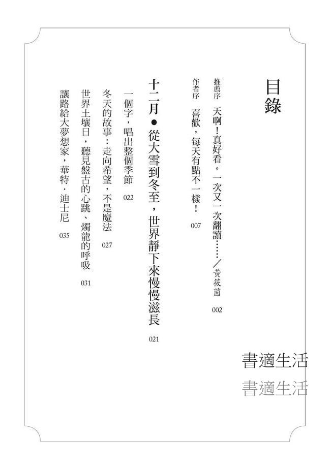 讀著冬日典故書,宛如為生活添加光焰,在封凍艱難的日子裡看見希望。隨著曆法演變,感受全世界從古到今的文化風俗,在新、舊兩個年間,調整生活速率,規劃未來,孕養著無限可能。