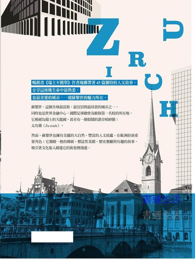 ★台灣坊間第一本關於蘇黎世的文化觀察專書,搭配圖片、有重點地分享世界金融之都的核心文化魅力。