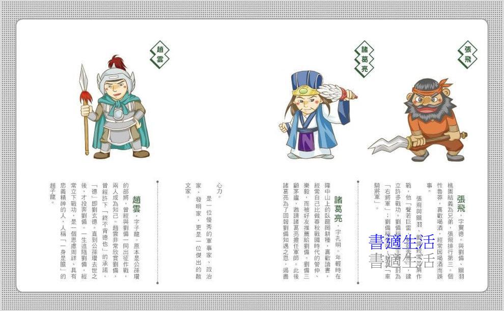 ★特色2.了解中國經典最佳入門書:改編自中國四大名著之一《三國演義》,小學生到青少年必讀經典故事。以「人物」為各書主軸,以「現代語言」述說人物故事,藉「事件」展露主角的個性特質;看三國人物如何在歷史舞台上呼風喚雨、以武力智力拚鬥,藉此激發小讀者對歷史故事的思考,發展出探討歷史真實的能力。