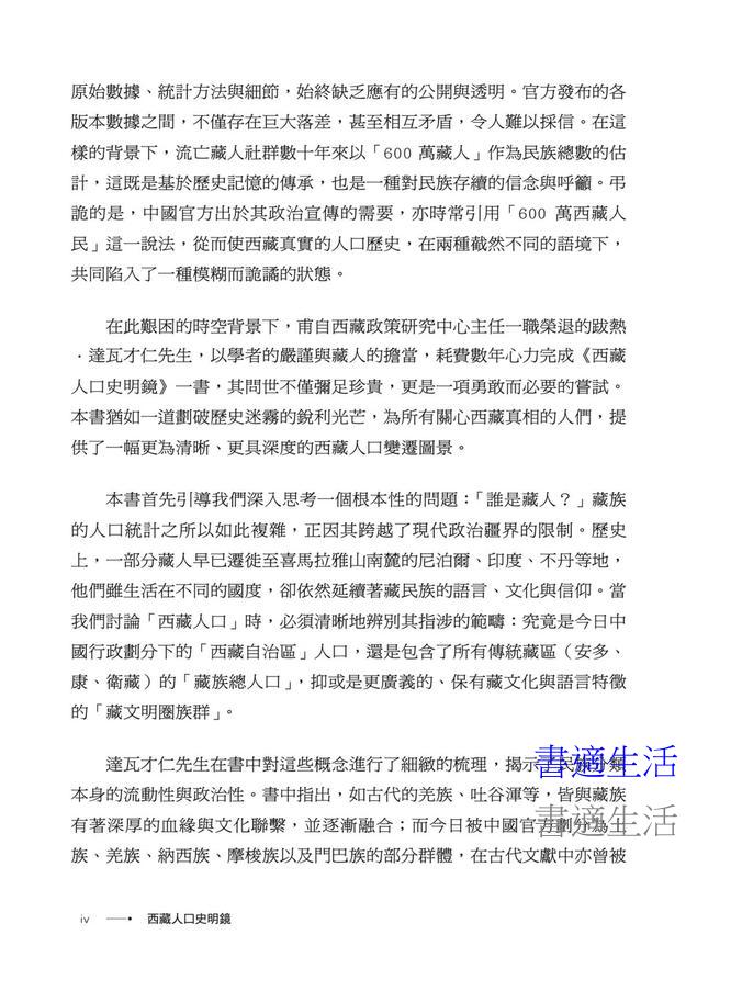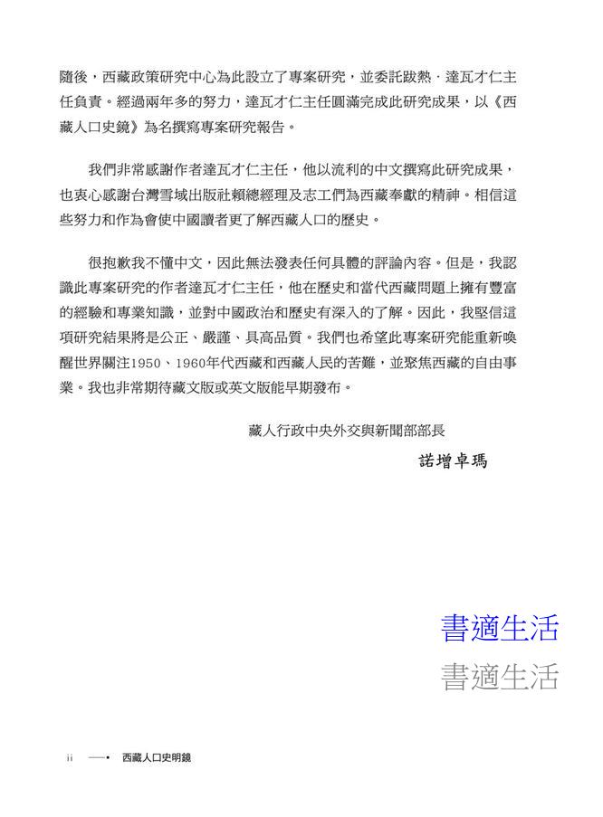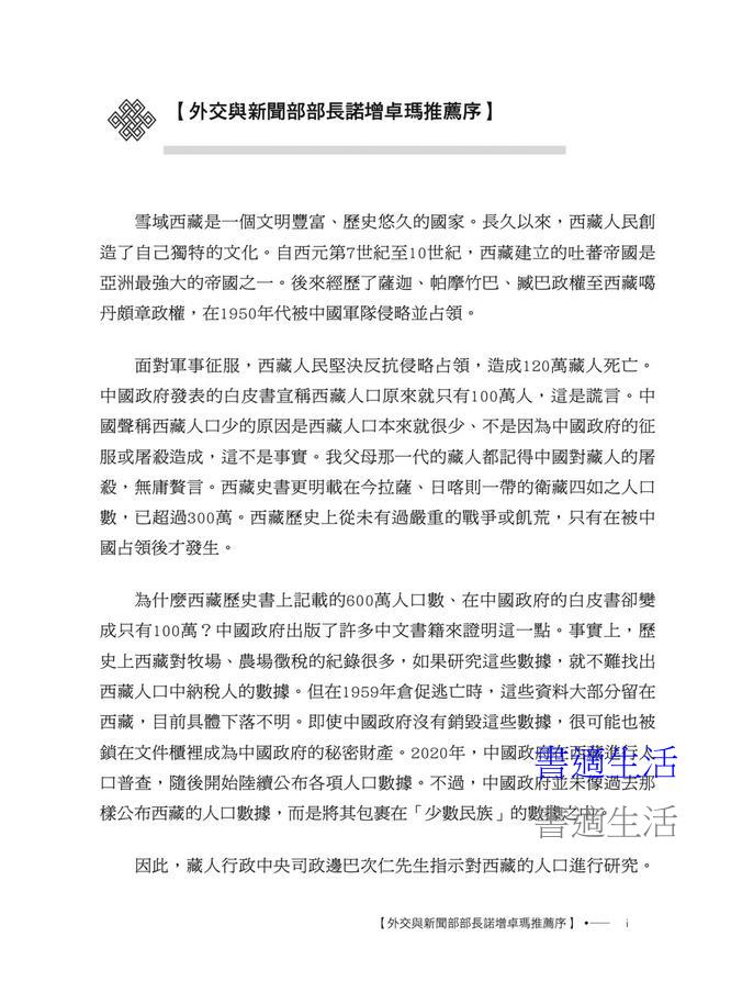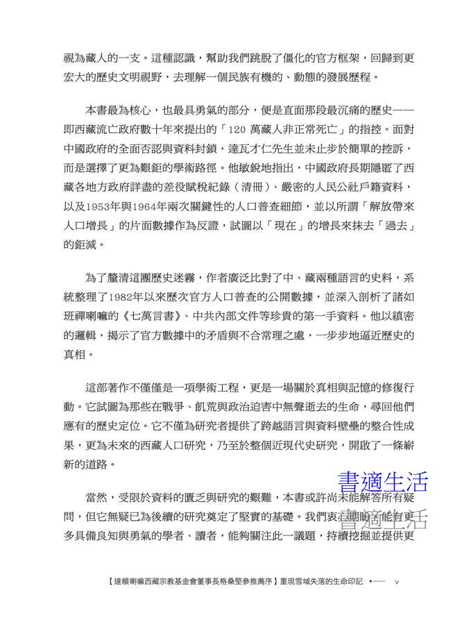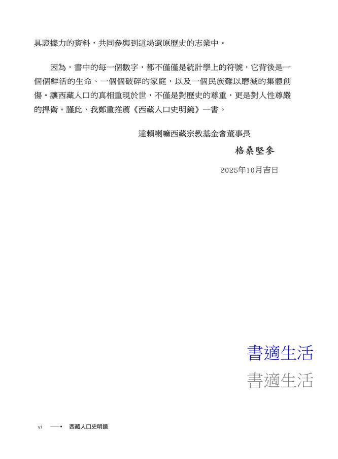 「書中的每一個數字,都不僅僅是統計學上的符號,它背後是一個個鮮活的生命、一個個破碎的家庭,以及一個民族難以磨滅的集體創傷。讓西藏人口的真相重現於世,不僅是對歷史的尊重,更是對人性尊嚴的捍衛。謹此,我鄭重推薦《西藏人口史明鏡》一書。」——巴瓦・格桑堅參,達賴喇嘛西藏宗教基金會董事長