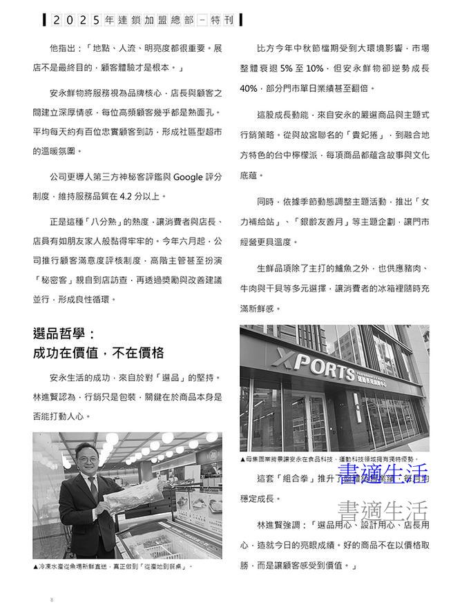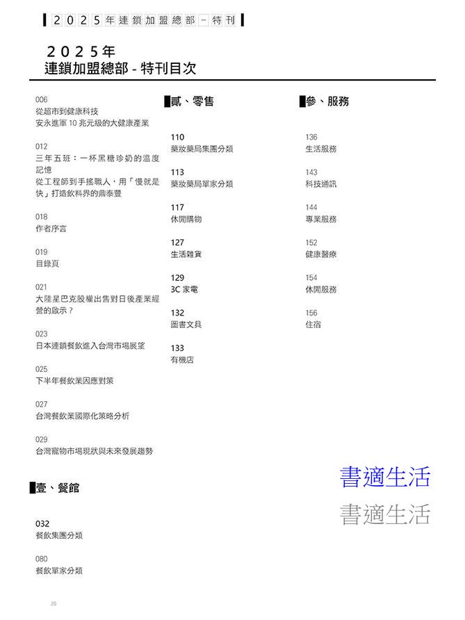 報導台灣主要連鎖加盟的脈動,包含全台各地主流連鎖業態之店數、資本額、國外分佈、營業規模及最新營運狀況。邀集各業態傑出營運負責人,分析經營戰略。對全台的服務業、零售業、餐飲業連鎖店動態進行整理,更收錄了重點業態、企業簡介、店數統計、總部資訊以及門市資訊,使讀者能夠明確掌握台灣各產業之現狀。