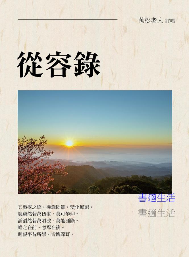 其中各則均分為示眾、本則(公案)、頌古(文中附加短評─著語)、評唱等四部分,示眾相當於《碧巖錄》之垂示,係說明一則之宗旨;本則為古則公案,敘述先人證悟之因緣;頌古為宏智以偈頌拈提,說明本則之宗旨;著語為將本則、頌古之語句加以解說短評;以評唱部分為本書重點。本書與《碧巖錄》併稱禪門二大寶典,《碧巖錄》屬臨濟宗系統,本書則屬曹洞宗系統。註疏有默紹之《從容錄頌解》一卷、松雲之《從容錄事略》十七卷、鼎三之《從容錄接觜錄》二卷、梵丁之《從容錄筆削》一卷等。(佛光大辭典)