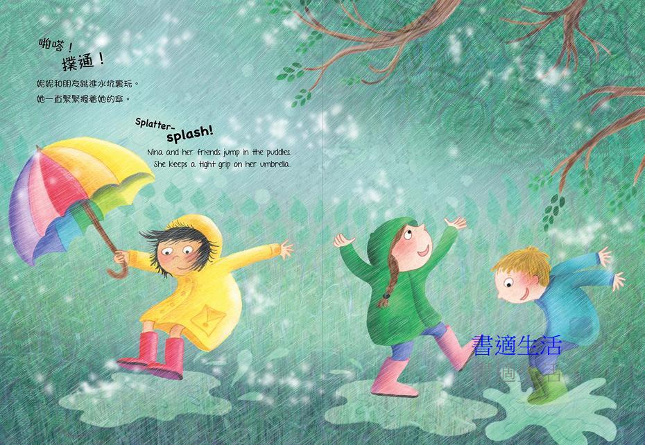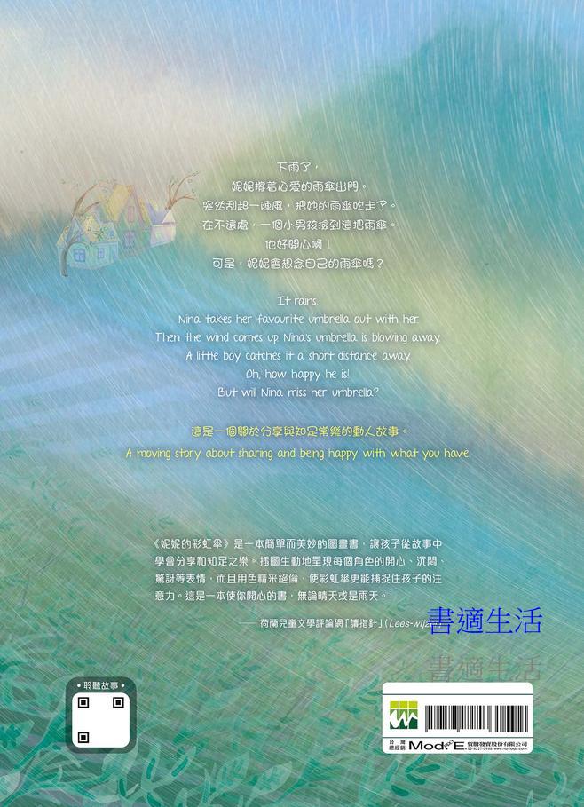 「《妮妮的彩虹傘》是一本簡單而美妙的圖畫書,讓孩子從故事中學會分享和知足之樂。插圖生動地呈現每個角色的開心、沉悶、 驚訝等表情,而且用色精采絕倫,使彩虹傘更能捕捉住孩子的注意力。這是一本使你開心的書,無論晴天或是雨天。」