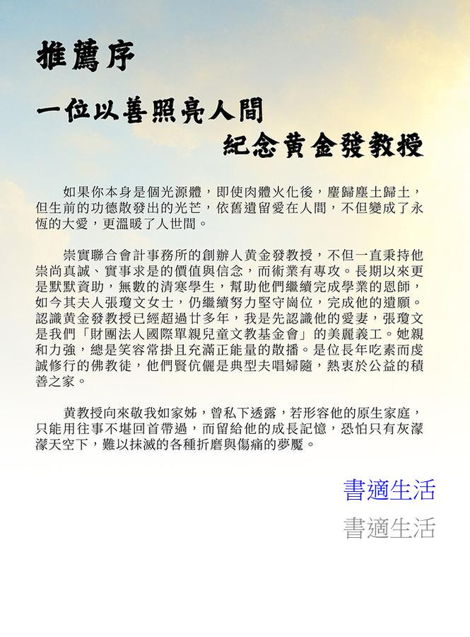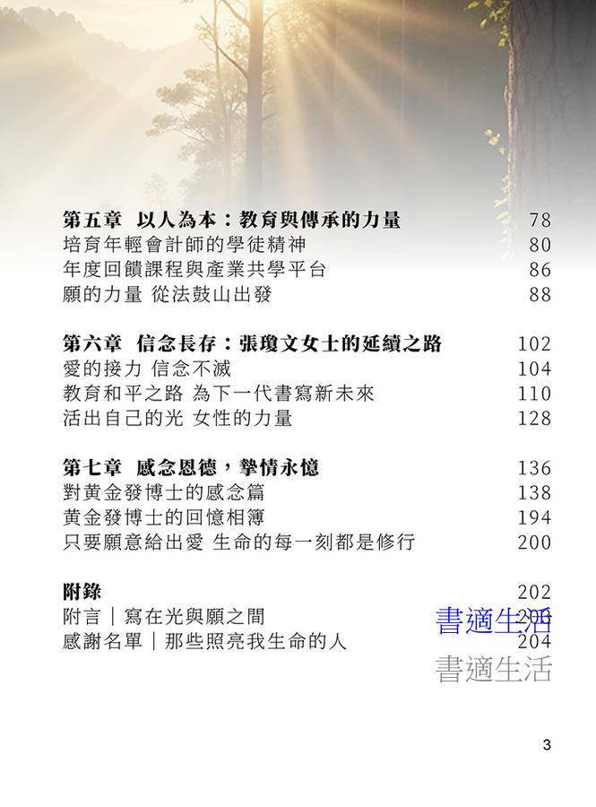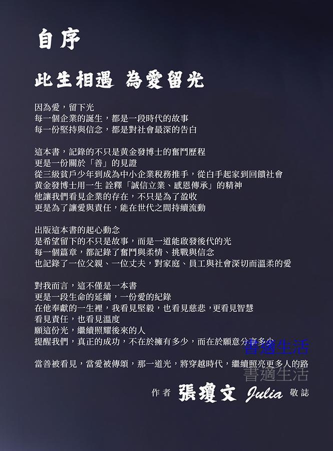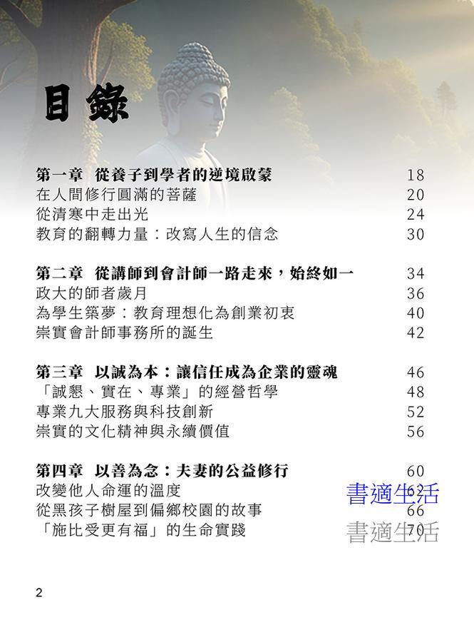 《崇實之光》記錄了崇實聯合會計師事務所創辦人黃金發博士的一生,一位從清寒養子走向商學博士、從教育者成為企業家的生命典範。他以「誠以立身,實以立業」為信念,將誠信、專業與善念化為事業的根本。崇實不僅是一間會計師事務所,更是培育人才與實踐公益的搖籃。與妻子張瓊文女士攜手,兩人以教育翻轉命運、以慈善回饋社會。如今,崇實在永續與愛的道路上繼續前行,讓真誠與良善成為企業的信仰,也讓這份光,照亮更多人的生命。