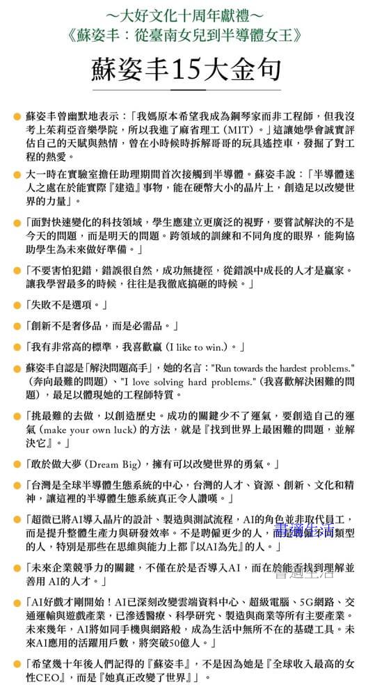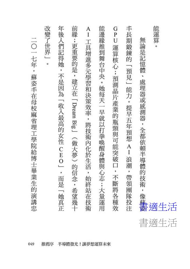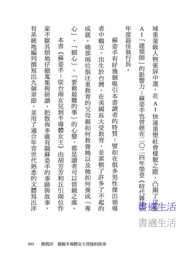 ◆從臺南女兒到半導體女王的蘇姿丰,跨越文化,穿越時代,以知性的科技核心、感性的性別支持,以及理性的精準與遠見,讓我們的眼界跟著她,走向更聰明、更包容的未來。