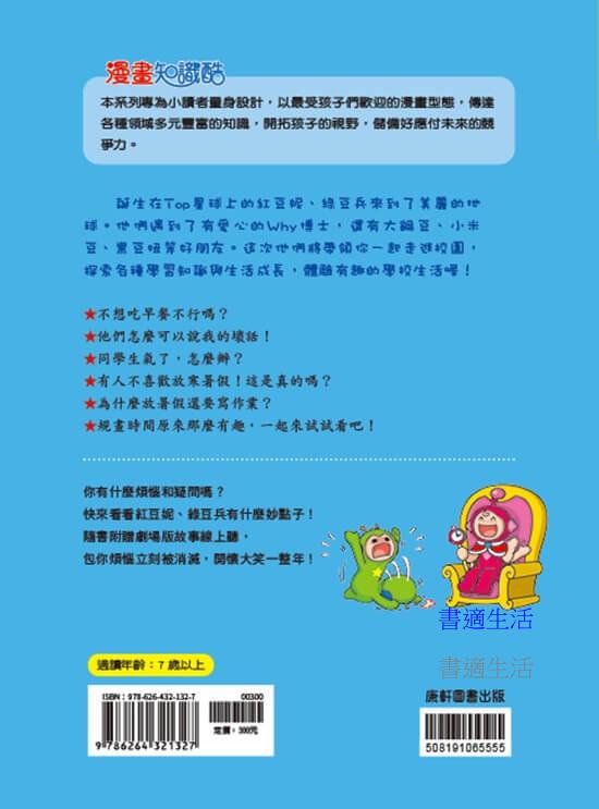 誕生在Top星球上的紅豆妮、綠豆兵來到了美麗的地球。他們遇到了有愛心的Why博士,還交到了大鋼豆、小米豆、黑豆妞等好朋友。這次他們將帶領你一起走進校園,探索各種學習知識與生活成長,體驗有趣的學校生活喔!