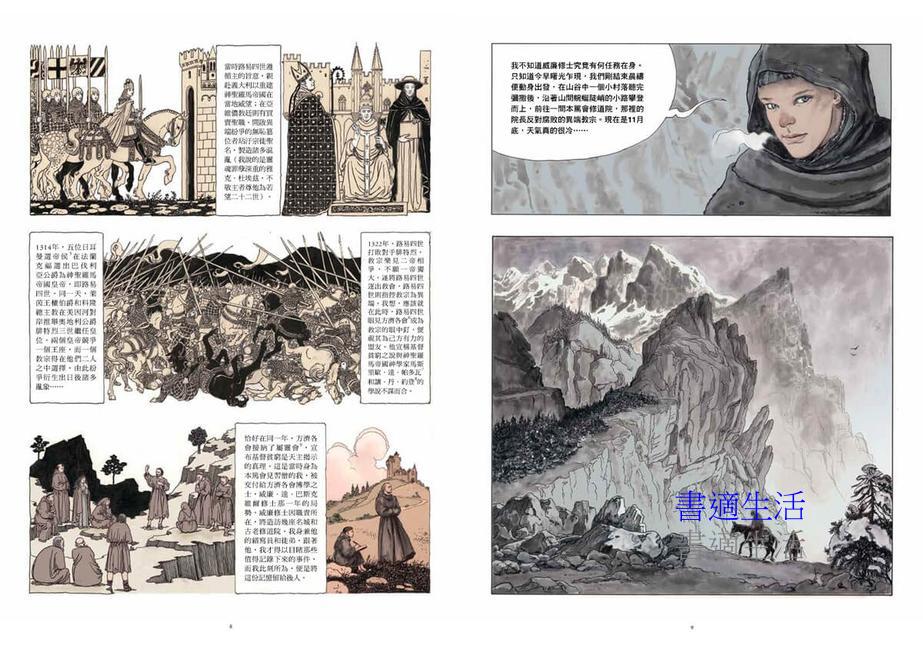 《玫瑰的名字》漫畫版,完美地解決了傾向用圖像溝通的這個時代閱讀文字耐性不足的問題,當然也完美地補足了我們面對中世紀歐洲,因為陌生而可能欠缺的想像力。好的小說,可以從文字出發想像圖像,好的漫畫反其道而行,可以從圖像出發想像文字。更何況執畫筆的人是米羅.馬那哈。