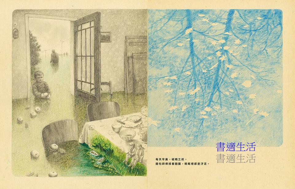 曾說過「圖像不應該重複文字已經說過的事」的尤安娜,在書一開頭就以連續的全景畫面和相簿般的畫面切片將讀者吸入有如披頭四名曲〈生命中的一天〉(A Day in the Life)的氛圍之中。你看到彷彿不同時間的湖面光影,時時變化、但一日復一日。書名頁之後畫風轉成淡淡的鉛筆和色鉛筆,故事敘述進入另一個脈絡: