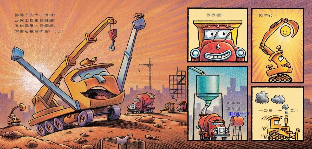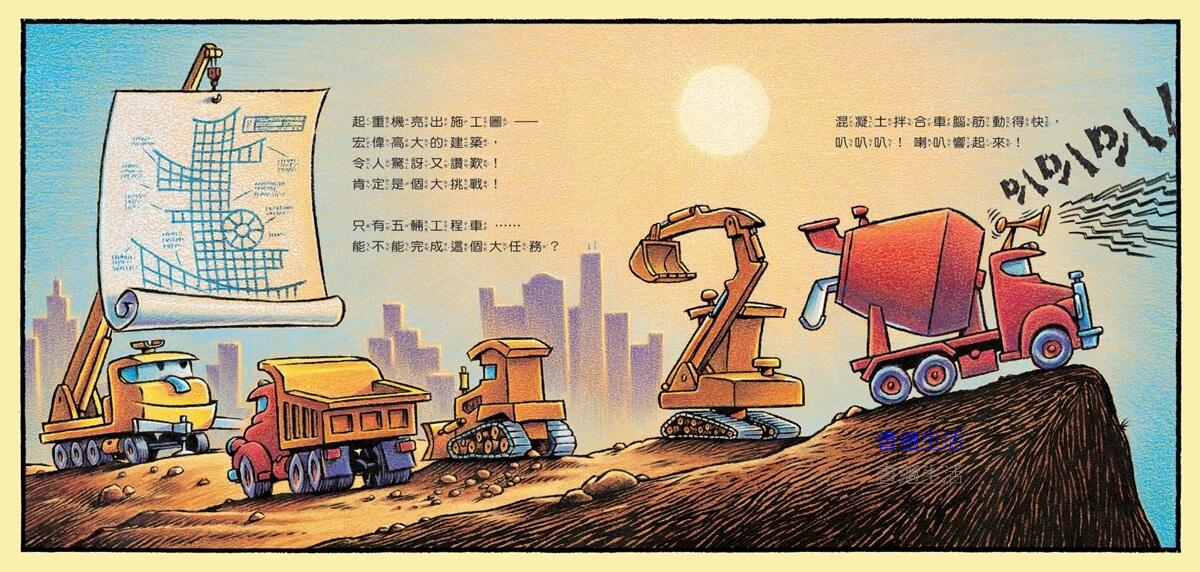 一大清早,在蓋房子的大工地裡,五輛工程車剛睡醒,伸伸懶腰,洗洗臉,準備迎接嶄新的一天!他們精神飽滿,充滿期待,今天就要開始為新工程而忙碌!但是,這個新任務是個大挑戰,只有起重機、混凝土拌合車、傾卸卡車、推土機和挖土機五輛工程車,有辦法完成這麼巨大的建築嗎?因此,他們召喚新夥伴來幫忙,裝載機、鏟土機、平板貨車、鏟裝機、混凝土壓送車加入團隊,一共十輛強壯的工程車,他們同心協力,團結合作,什麼工作都能完成!