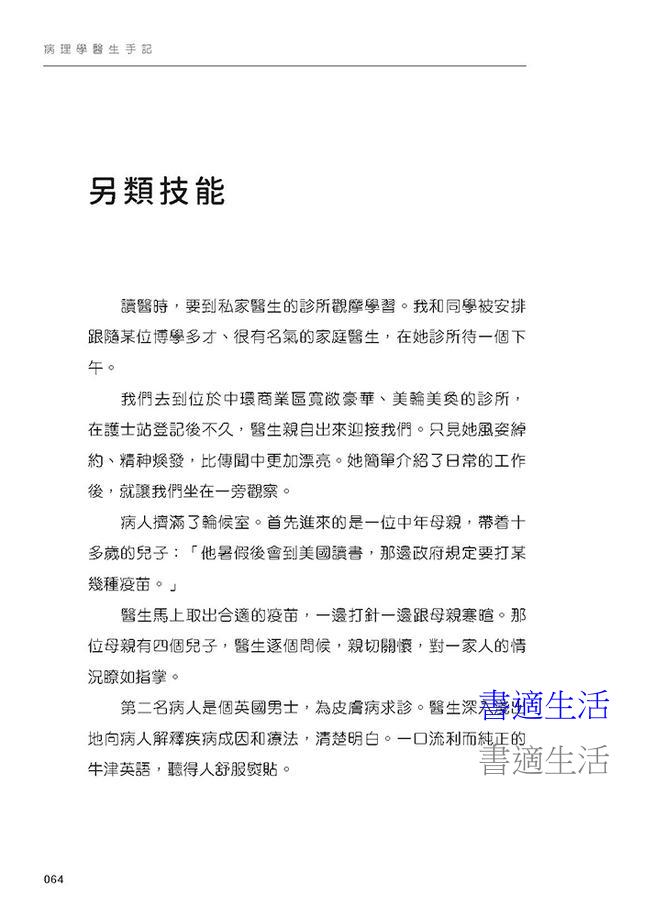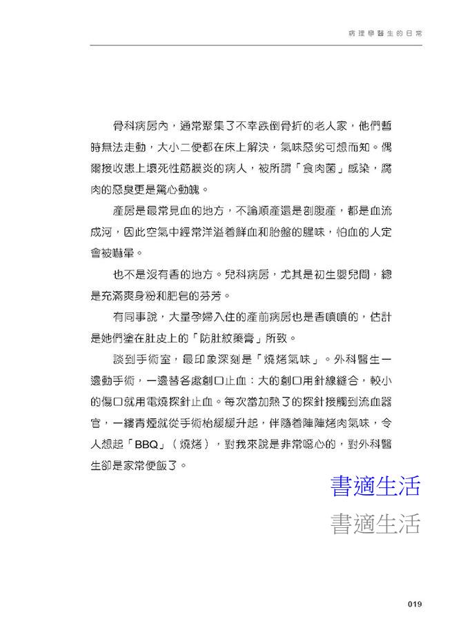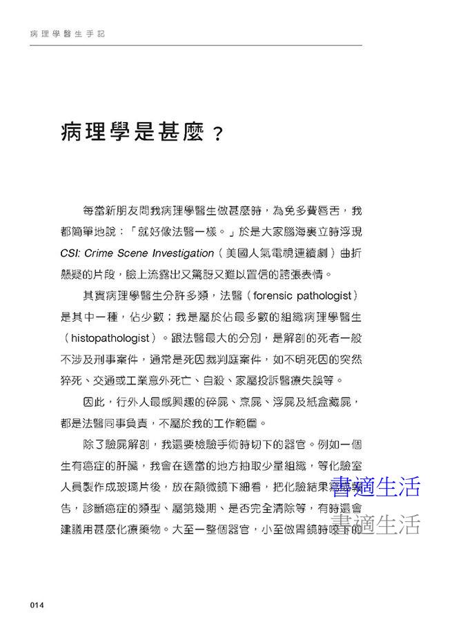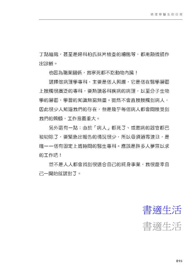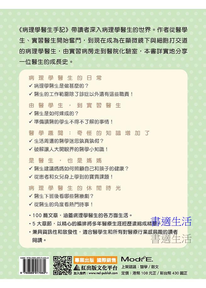 本書分開醫生日常工作、醫學生、醫學冷知識、醫生媽媽、醫生下班後五個部分,以100篇短小精悍的文章分享病理學醫生的世界,記錄一個醫生的成長史,兼具資訊性和啟發性,適合醫學生和所有對醫療行業感興趣的讀者閲讀。