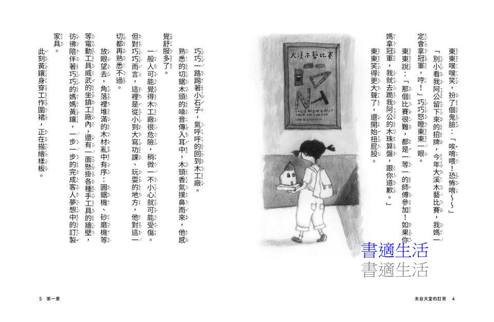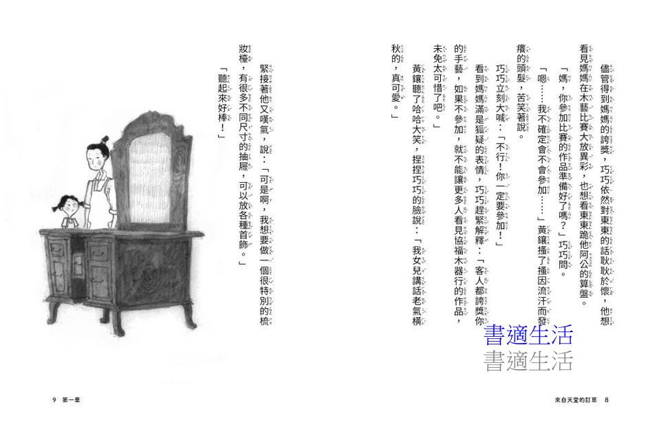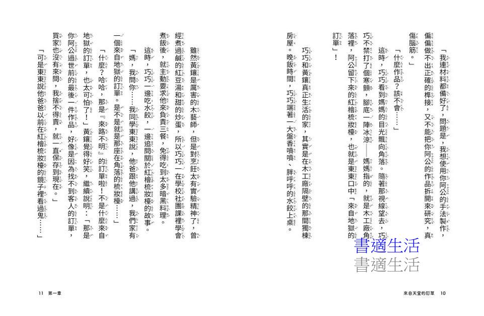 扣合著世代的技藝與記憶傳承主軸,透過「來自地獄的訂單」和「來自天堂的訂單」飽含矛盾又詩意的轉折,讀者在不斷猜問的奧妙情節過程裡,無論是巧巧、黃鑲、阿旺,每個角色的成長,在在傳遞出永恆未竟的愛裡蘊藏著無限的支持力量。