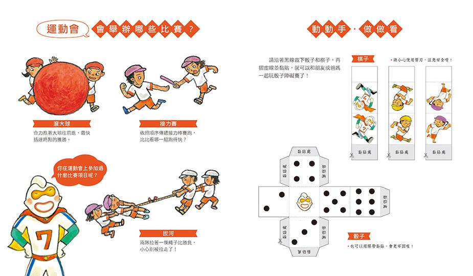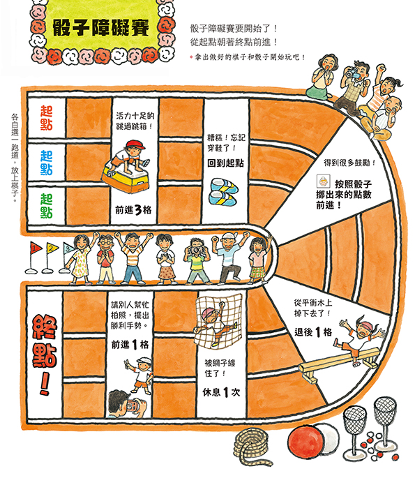 書末作者也介紹了滾大球、接力賽和拔河等運動會常見的比賽,家長可以藉此和孩子討論運動會還有哪些活動、自己喜歡與擅長的項目,或是參加運動會面對挑戰和獲得成就感時的心情與體會,讓孩子感受到運動會的競賽精神與樂趣。隨書附贈骰子障礙賽遊戲,動手DIY裁剪黏貼紙棋和骰子後,就可以和孩子一起擲骰子玩障礙賽唷!透過遊戲,孩子能體驗到跟在挑戰與挫折後面的,往往是更大的快樂與滿足,平常心面對,熱情參與就對了!