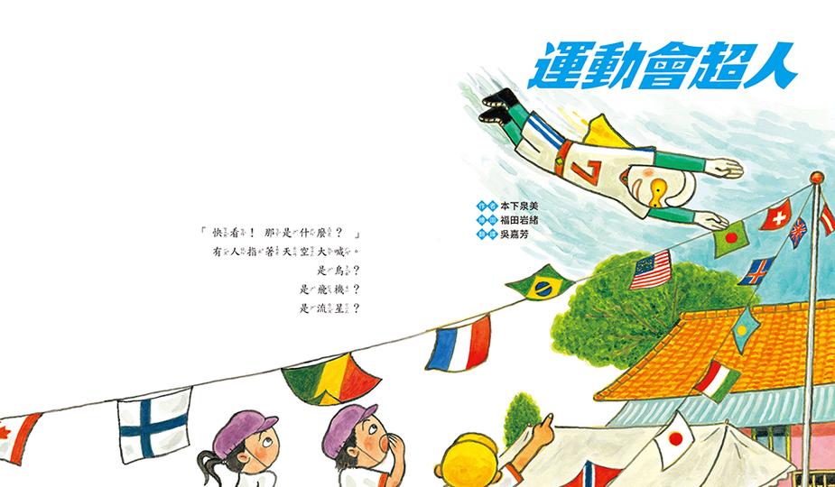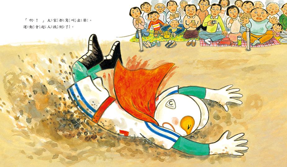 說完,運動會超人開始做暖身操。「預備,開始!」運動會超人一馬當先的向前衝,一路遙遙領先,大家在後面拚命的追……突然,運動會超人跌、倒、了!大家驚叫出聲!這、這……超人也會跌倒?那、那……小詩最後能順利跑到終點嗎?