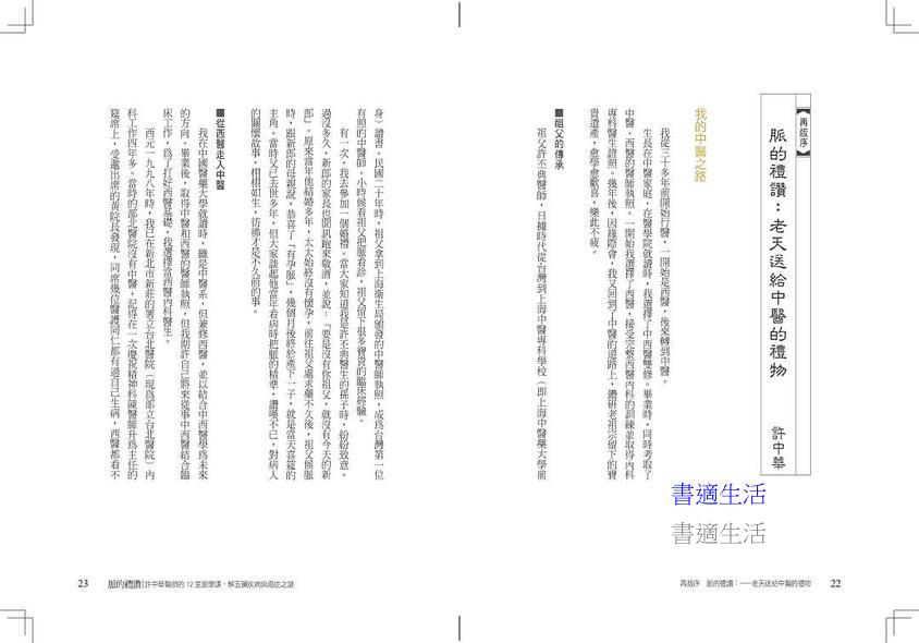 現任陽明交通大學中醫系暨傳統醫藥研究所教授許中華,出身中醫家族,祖父許丕典是在1931年正式領有中醫師執照的台灣籍中醫師。《脈的禮讚》是許醫師根據自己中西醫學背景以及30多年的臨床診治經驗,在陽明大學傳統醫藥研究所教授脈學的集結。全書共分12堂課,不只談脈學的理論與實務,也論及把脈是中醫「辨證論治」的核心,並且臨床舉例解釋脈與五臟,更有專章介紹「癌症脈證」。