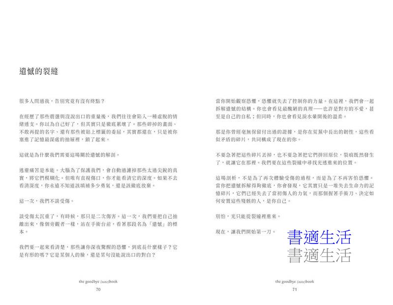《the goodbye (note) book告別練習日記: 遺憾,是還留在過去的你自己》,透過書寫、停頓與自我對話的設計,