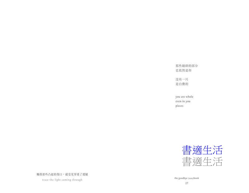 在閱讀與書寫之間,書中穿極簡金句與短詩,為情緒留出呼吸的空間。那些簡短而克制的文字,不急著給答案,而像一盞微弱的燈,陪伴你在自己的內在風景中慢慢行走。這不只是一本閱讀的書,而是一段可以被親身參與的療癒旅程。
