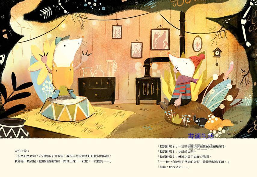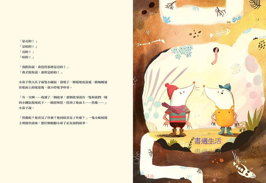 其實長者老鼠天天都到上面去,他知道上面是亮的也是暗的。白天時,太陽出來了,上面就是亮的;夜晚時,月亮和星星出來了,就是黑暗中閃著點點光芒。認真說來,小鼻子和大爪子都是對的,但也只對了一半,他們並沒有看到世界的全貌。想要真正看清上面的樣子,必須有勇氣張開眼睛。這些小鼴鼠們也許會花上更長的時間才能有睜開眼睛的勇氣,但他們終究會到地面上親眼看看外面到底有什麼在等著他們的。這就好像我們每個人的成長一樣,總要在懵懵懂懂中自以為是的跌跌撞撞,然後,有一天夠成熟了,才會恍然大悟原來以前的自己欠缺的是什麼……