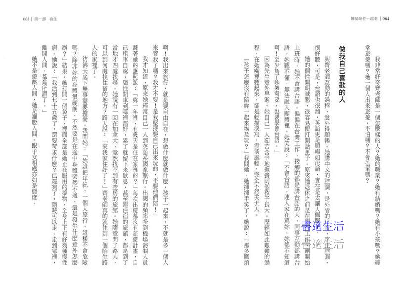 作者站在醫療現場與家庭生活的交會點,面對生活中迎面而來的諸多事情,寫下自己如何成為女兒、媳婦、妻子、母親,也如何一步步成為「會老的那個人」。