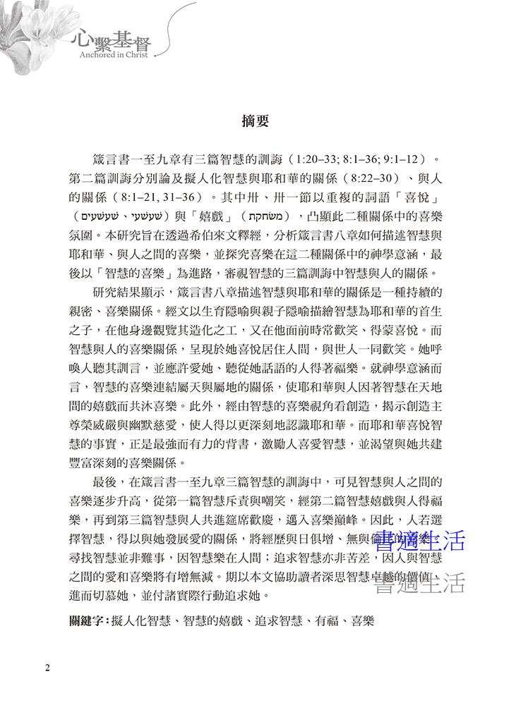第一講 智慧的喜樂:從箴言書第八章論擬人化智慧與耶和華並與人關係中的喜樂-阮凱文/1