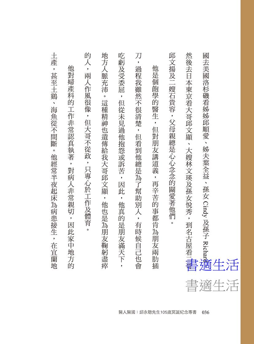 在家父一○五歲冥誕紀念之際出版《醫人醫國 : 邱永聰先生105歲冥誕紀念專書》,作為家族世代傳承與後代子孫永遠的懷念。