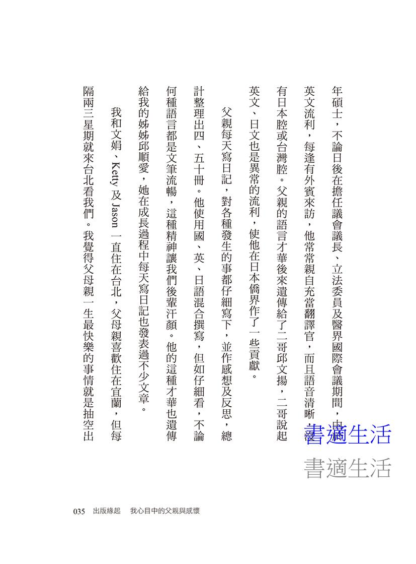 ◆謹以此書,紀念我們的父母:邱永聰先生和邱黃素女士,生如夏花般絢爛的人生◆ 父親與母親留下了愛、謙卑與堅忍的榜樣,他們的精神永遠是我們家族的典範。