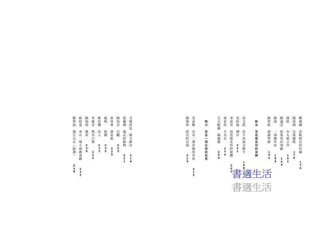 目錄: 目次 宇文正 一座詩的島嶼 《2023臺灣詩選》序 輯一 我想和你虛渡此生 陳克華 我想和你虛渡此生 沈眠 世界上最適合愛情的人 洪萬達 隧道 路寒袖 菊心 楊瀅靜 慎重 林瑞麟 背面 廖偉棠 生日童話 羅毓嘉 母字 葉莎 我想為你代言 一靈 按按兩帖 然靈 你來 輯二 任何悲傷都值得溫柔一提 李進文 回憶 湖南蟲 自拍流出 嚴忠政 在微小裡 印卡 不分享的快樂遲早消逝 楊小濱 斑鳩失蹤指南 鴻鴻 偷懶頌 瞇 很像,但不是 黃岡 氣數喪盡歌 阿布 中年 辛金順 一生 楊智傑 死亡 唐捐 一世之傷 輯三 炊煙是昇華的樹 柴柏松 白瓷之路 紀小樣 日暮之景 任明信 小徑 林達陽 鋼琴 焦桐 玉荷包頌 張繼琳 農村曲 馬翊航 風景與工作的眼睛 楊澤 二一六巷漫興 李有成 我走在檳城街頭 小熊老師 貓頭鷹的孵夢森林 姚時晴 天空之外的天空 王怡仁 我們談天空 林婉瑜 高空發生的事(外二首) 林彧 歲末(外一首) 蔡忠修 菩堤寺 廖咸浩 入藏:浴佛節記事 輯四 沿著時間的航線 白靈 最壯麗的紙 劉曉頤 我曾死過一分鐘 賴文誠 沿著時間的航線 林禹瑄 他說下星期一起到基希涅夫 田煥均 海街日記 鄭琬融 柔軟源自於何處 陳家朗 公廈靈柩 隱匿 在九槍之中 陳義芝 如果你住加薩 鍾喬 一個劇作家 陳育虹 感謝寧靜 輯五 浪花捲走你的身體 須文蔚 你不再說文解字 吳鈞堯 潮汐 李長青 浪花捲走你的身體 潘家欣 月光白 毛玉配慮 躲貓貓 輯六 活在一個比喻的世界 范家駿 活在一個比喻的世界 謝旭昇 雨天的定義 李寧介 徵文辦法 張瀚翔 儀式的動物 陳怡芬 幻聽 崔舜華 譫妄歌 鹿鳴 抹醬 楊佳嫻 造人 李蘋芬 熱天小事 陳柏煜 瀑布 蘇紹連 車在一個小城鎮迴繞 羅智成 預言又止(節選)