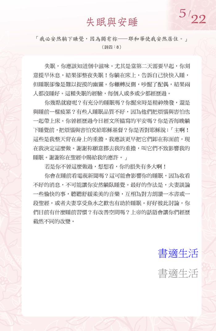 本書的使用方法是:夫妻間要先訂定對彼此二人最適宜確切的時間,且定意每日用五至十分鐘一起閱讀、思索、分享當日靈修的看見與亮光。務必開口朗讀每日的靈修文,兩人之間可以每天或每週輪流朗讀,最後,並花時間來到上帝面前一起禱告(開聲或默禱都可以),為當日的靈修劃下完美的休止符。如此,必能幫助夫妻二人更加同心、同行天路。
