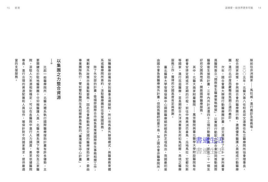 這本書詳細爬梳北醫二十年來的國際醫療援助經驗,同時彙整切實可行的執行模式,透過實際案例分享,讓外界認識北醫在國際醫療上的能力及行動力,立下北醫執行國際醫療援助計畫的典範地位,並傳達一所醫學大學的教育理念。