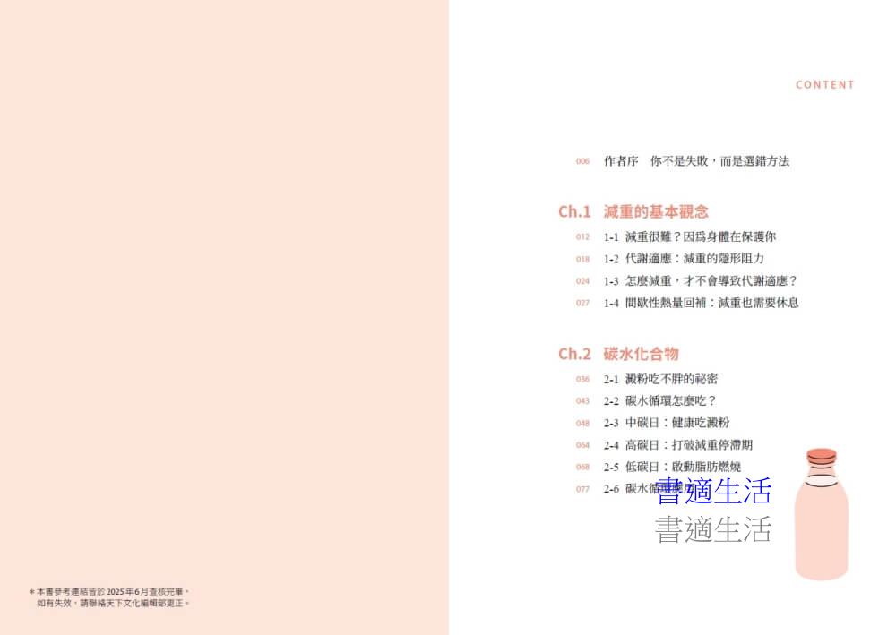 本書從建立正確的減重觀念出發,逐步分析三大營養素在「碳水循環飲食」的攝取原則,結合實用的運動建議,幫助你重新掌握自己的身體節奏,成功打造健康、穩定、可長久維持的理想體態!