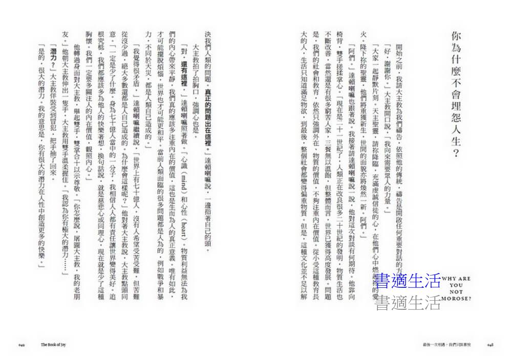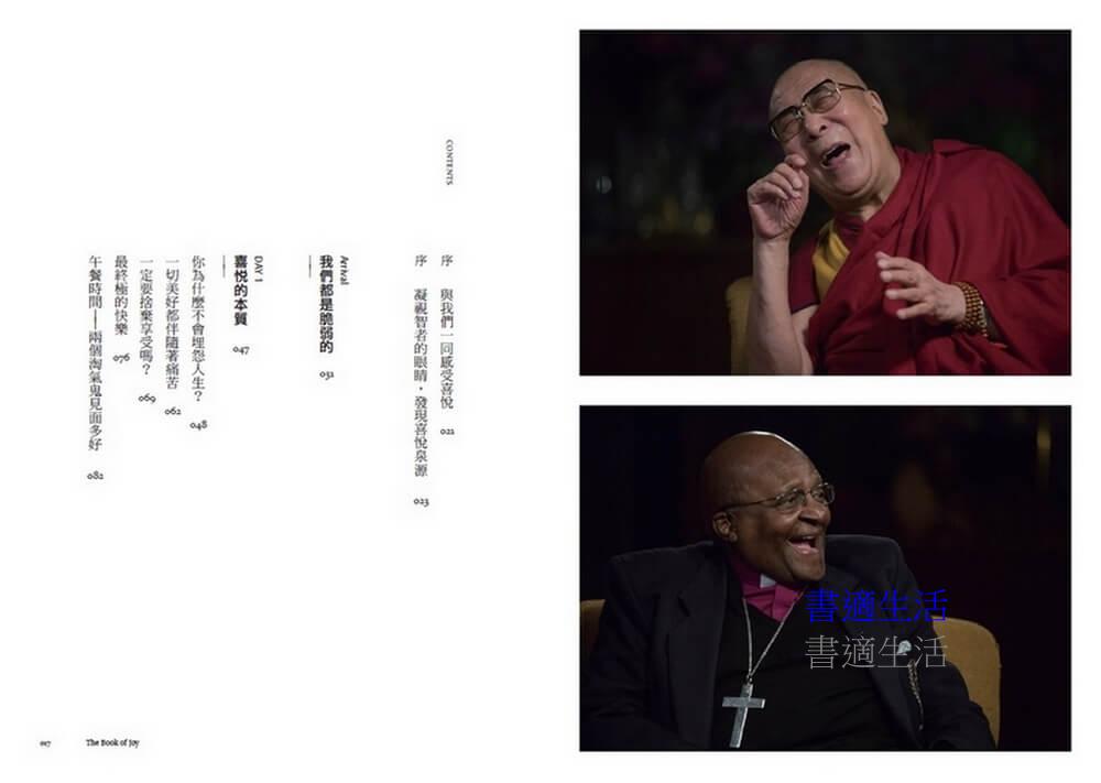 大主教從未自稱聖徒,達賴喇嘛也稱自己只是一介僧侶,他們的人生嚮往,與你我並無不同。兩人的人生看來充滿混亂與苦痛,卻能在其中尋得平靜、勇氣與喜悅。他們說,苦為人所不能免,但我們可以選擇如何面對苦痛,我們都能學會在充滿挫折與苦痛的環境,依然懷抱喜悅而活。