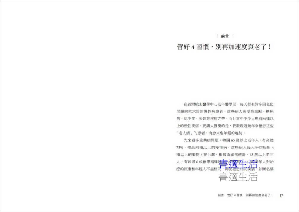 不容忽視卻沒人告訴你的老化真相。繼續目前的生活習慣,就算更長壽,未來住院的時間也會跟著變長。想像一下︰人生最後10年,直到90歲,甚至100歲離世,都躺在醫院裡度過的畫面。作者涵蓋醫學、科學、社會學、經濟學、人文學、宗教等層面,講述自己的4M養生之道,並分享給讀者,你也可以做好自我健康管理,進而延緩衰老,這個過程中,除了預防疾病,還能收獲更美好的人生。—首爾大學醫院腫瘤內科醫師 金範錫