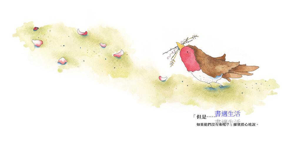 老是擔心不完的羅賓,接著又擔心萬一蘋果太重,皮普的樹枝是不是能撐得住;然後,又擔心蘋果落地了,皮普是不是會想念他們……