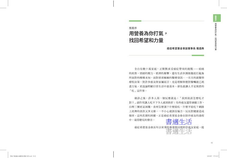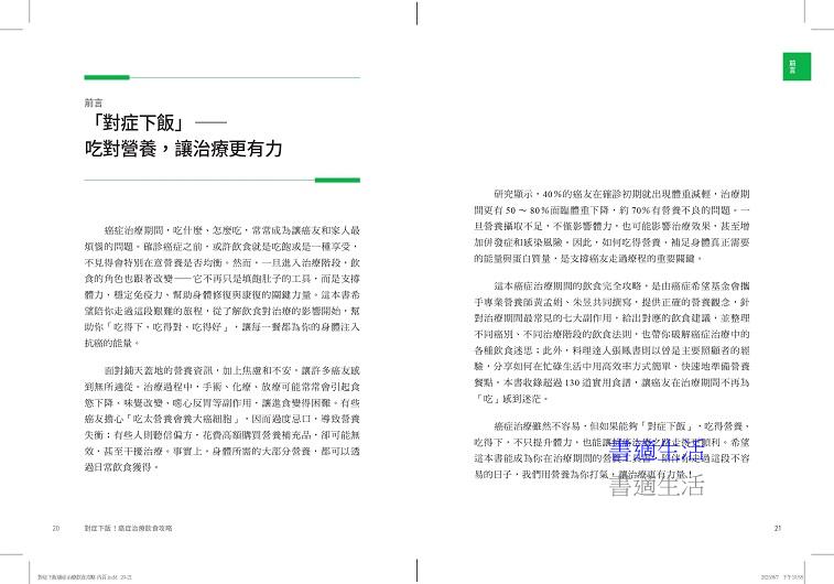 書中也破解謠言迷思、說明正確營養觀念,並針對特殊癌別提供不同階段的飲食建議。依照本書示範,能夠精準補足癌友所需營養、幫助緩解副作用,讓癌友對症下飯,抗癌更有力!