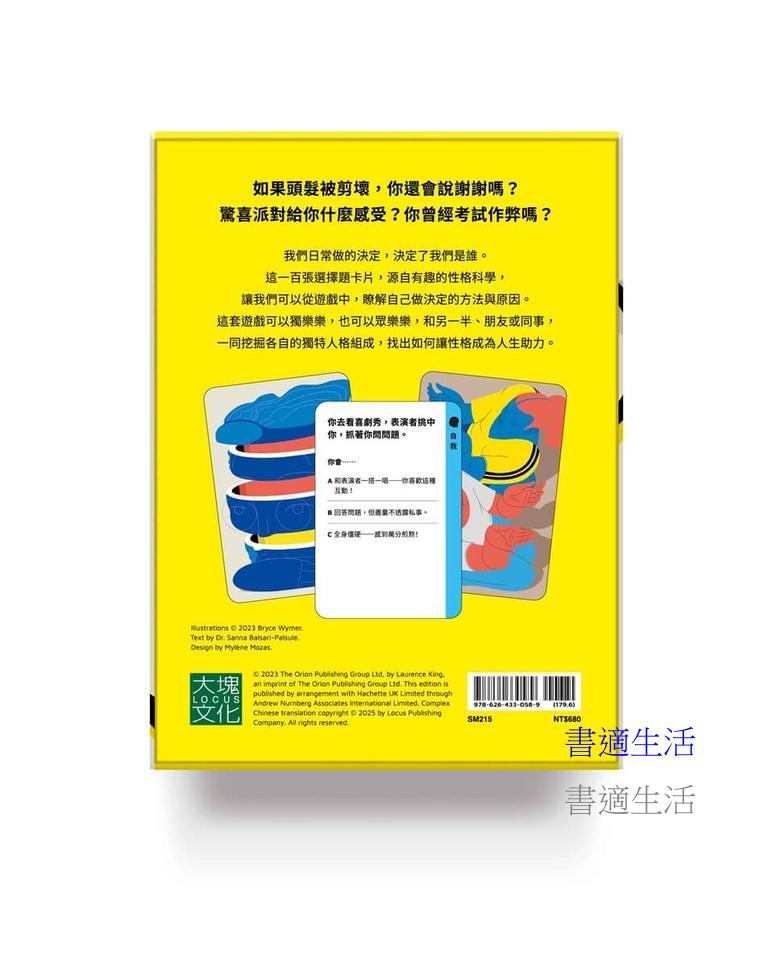 我們日常做的決定,決定了我們是誰。這一百張選擇題卡片,源自有趣的性格科學,讓我們可以從遊戲中,瞭解自己做決定的方法與原因。這套遊戲可以獨樂樂,也可以眾樂樂,和另一半、朋友或同事,一同挖掘各自的獨特人格組成,找出讓性格成為人生助力的方法。