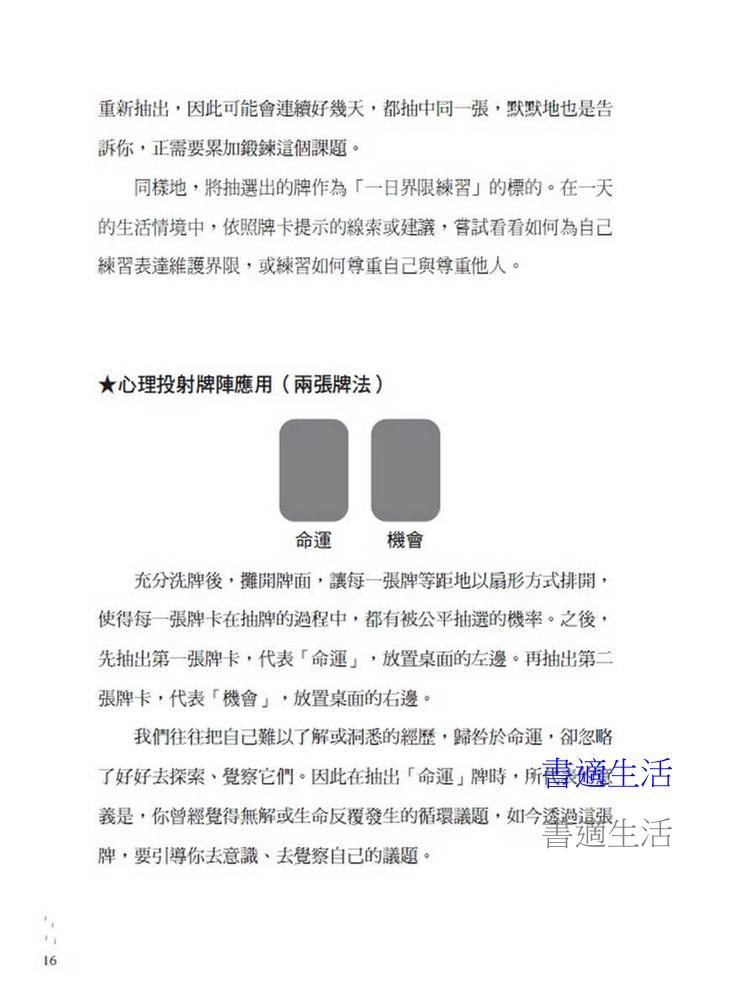 晨起抽一張,穩定一天的能量;睡前抽一張,反思一天的情緒界限;或心情混亂時抽牌,找到界限模糊的情境。透過牌卡的情境引導、金句提醒與練習,辨識出內在的壓力點與盲點,逐步建立一套「溫柔且堅定」的心理空間。