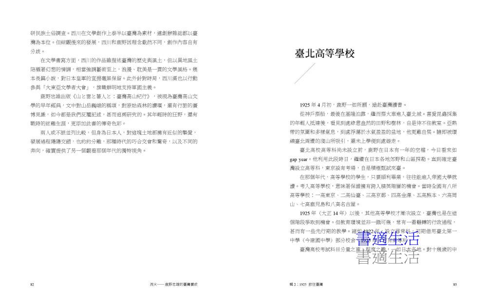 將近三十萬字的書寫,以地域分區,搭配時間軸線,從少年鹿野娓娓道起,直至1933年底次高山最終回的調查。內容涉及廣泛,每一面向皆是學問。除了直接分析,也援引當時的日籍或臺籍人物,例如鹽月桃甫、明石哲三、林獻堂、陳澄波、辜振甫、高一生、王雨卿等。透過這些人物的創作或足跡,輝映出鹿野忠雄的多元面向。