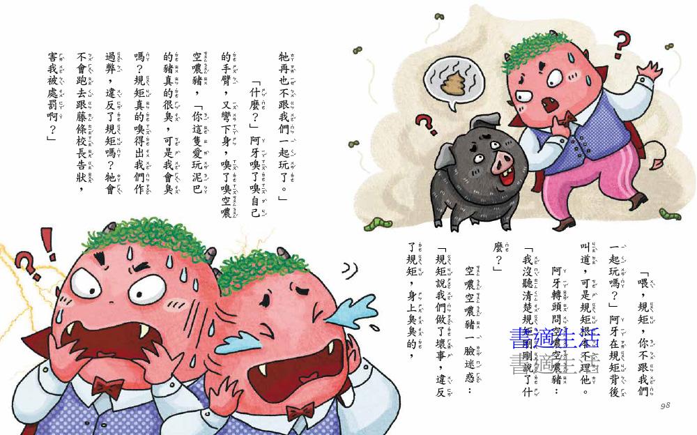 【小魔鬼遇上豬隊友】以品格教育為主軸,書中的每則故事都沸騰有勁,「笑」果十足,並闡述不同的主題,例如:面對霸凌不懼不怕、考試作弊的後悔與不安、成功與輸贏的真正價值……等,激發孩子對所見所聞產生疑問,從而啟動追求原由的力量,啟發明辨是非善惡的能力,打造好品格!