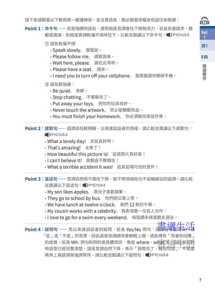 2. 口語能力訓練(Chapter 2):針對發音不準的問題,從「理解文字 & 切割詞組」入手,教標記重音及連音、特殊發音規則、加入情緒、錄音比對改進。讓你的口說更清晰、自然、有節奏感,避免考官聽不懂。
