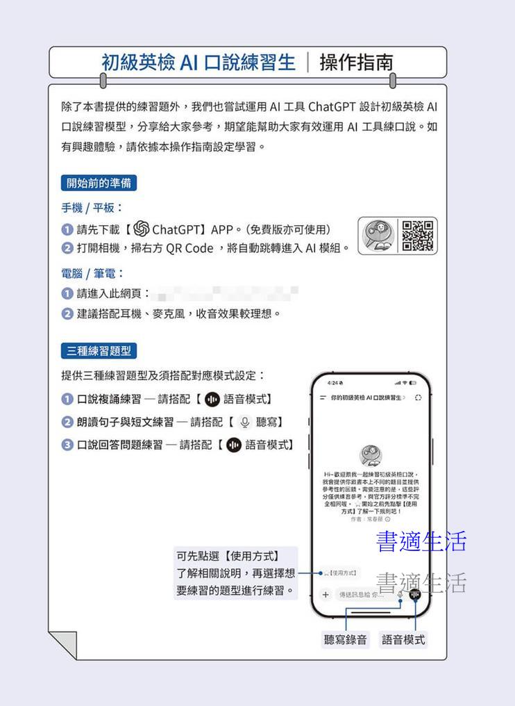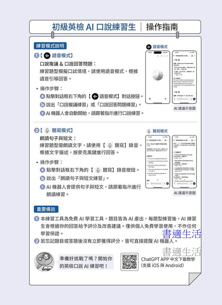 1. 免費AI口說練習生:掃QR Code,使用AI評分你的發音、流暢度與內容,強化應考自信。(僅供練習參考,實際考試評分以主辦單位公告標準為準。)