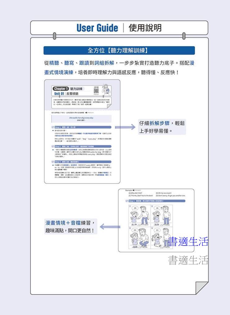 從精聽、聽寫、跟讀到詞組拆解,一步步紮實打造聽力底子。搭配漫畫式情境演練,培養即時理解力與語感反應,聽得懂、反應快!