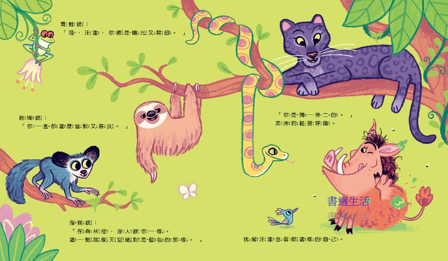 汪達也喜歡這樣的自己。直到有一天,一群美麗而優雅的金剛鸚鵡,如彩虹般飛過森林上方的天空,所有動物的目光都被他們吸引了,包括汪達。